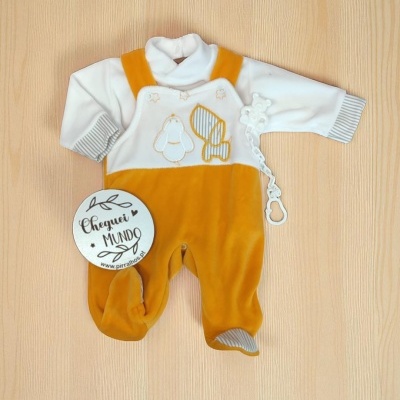 Conjunto de três  peças de veludo (80% algodão, 20% poliester) , inclui a jardineira ajustável em altura , camisola de manga comprida , prende chucha  , modelo de confecção nacional